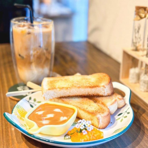 タイ・ミルクティー風味のカスタードトースト&フォイトーン のデザートドリンクセット♪タイミルクティーのほのかな甘い香りのカスタードクリームを焼きたてトーストに!卵と砂糖のシンプルな味わいが楽しめる『フォイトーン』を添えて(着色料は使用せず、卵黄の色そのものです)。
